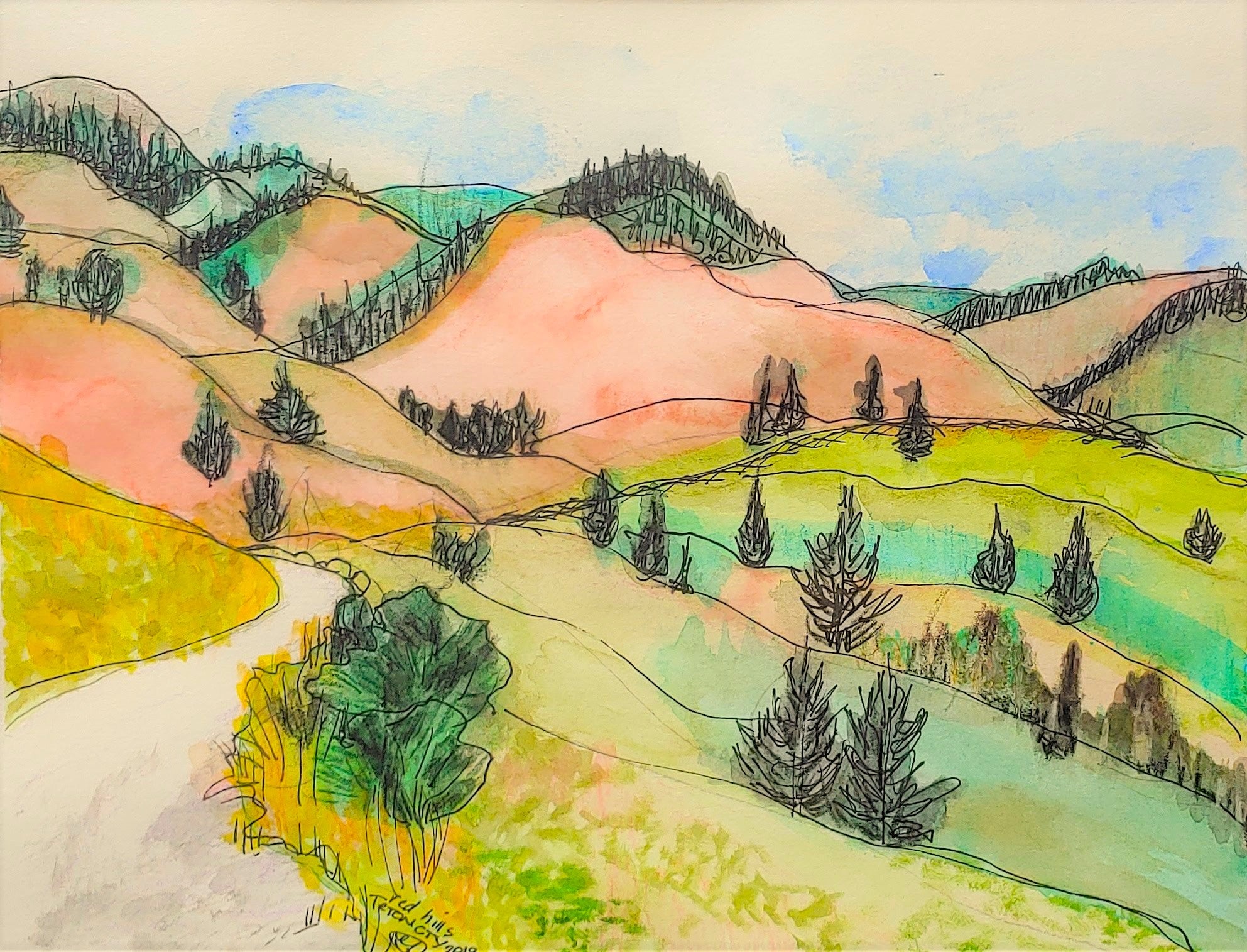 I painted this scene from both life and memory — a view from the rugged road leading into my husband Gene’s hunting camp in the Gros Ventre wilderness. Around this particular bend, crimson and rose-colored slopes unfold into soft greens and sage shadows. That moment — when the hills seem to glow with anticipation and awe — stayed with me long after I returned to my studio.