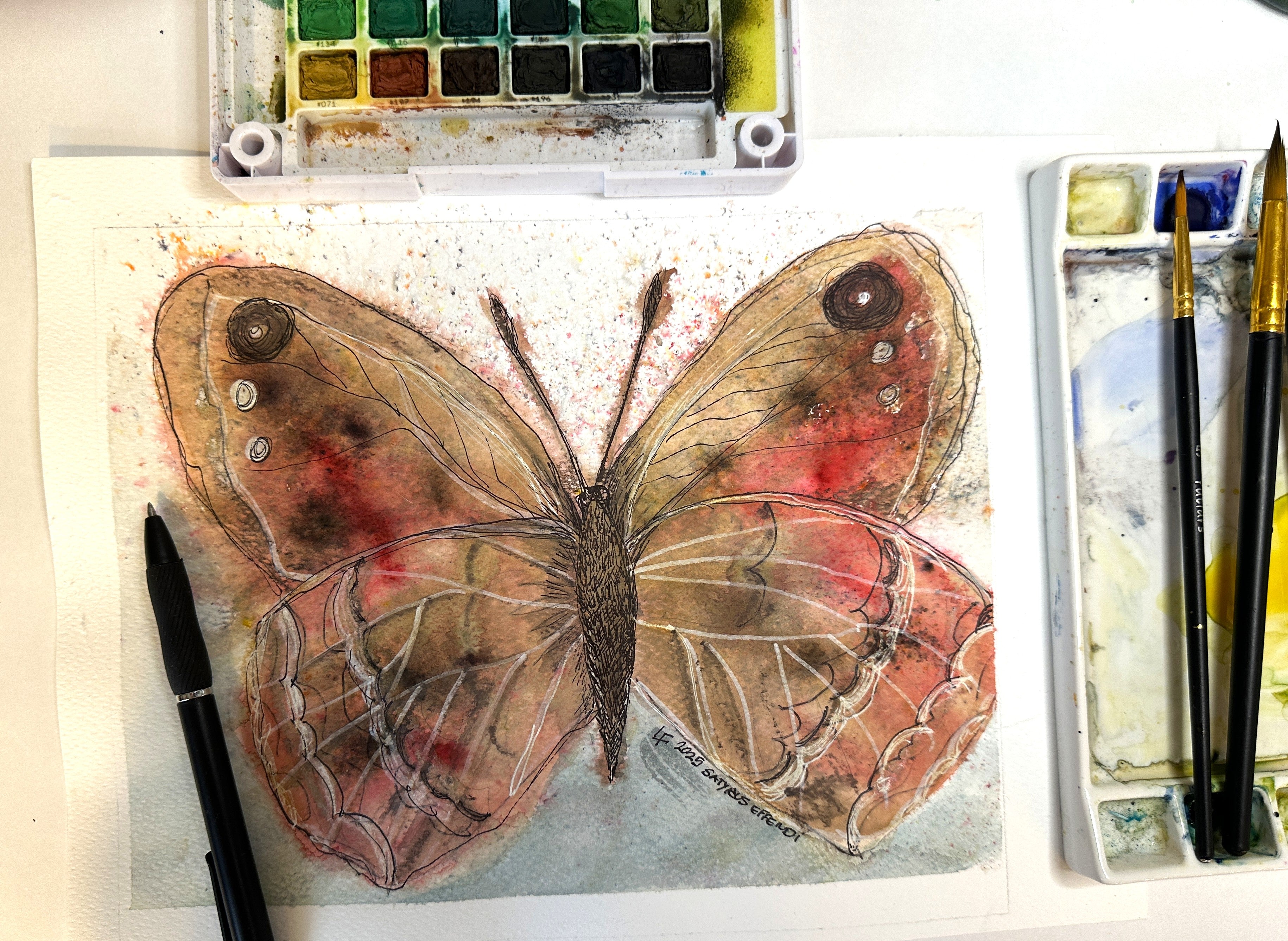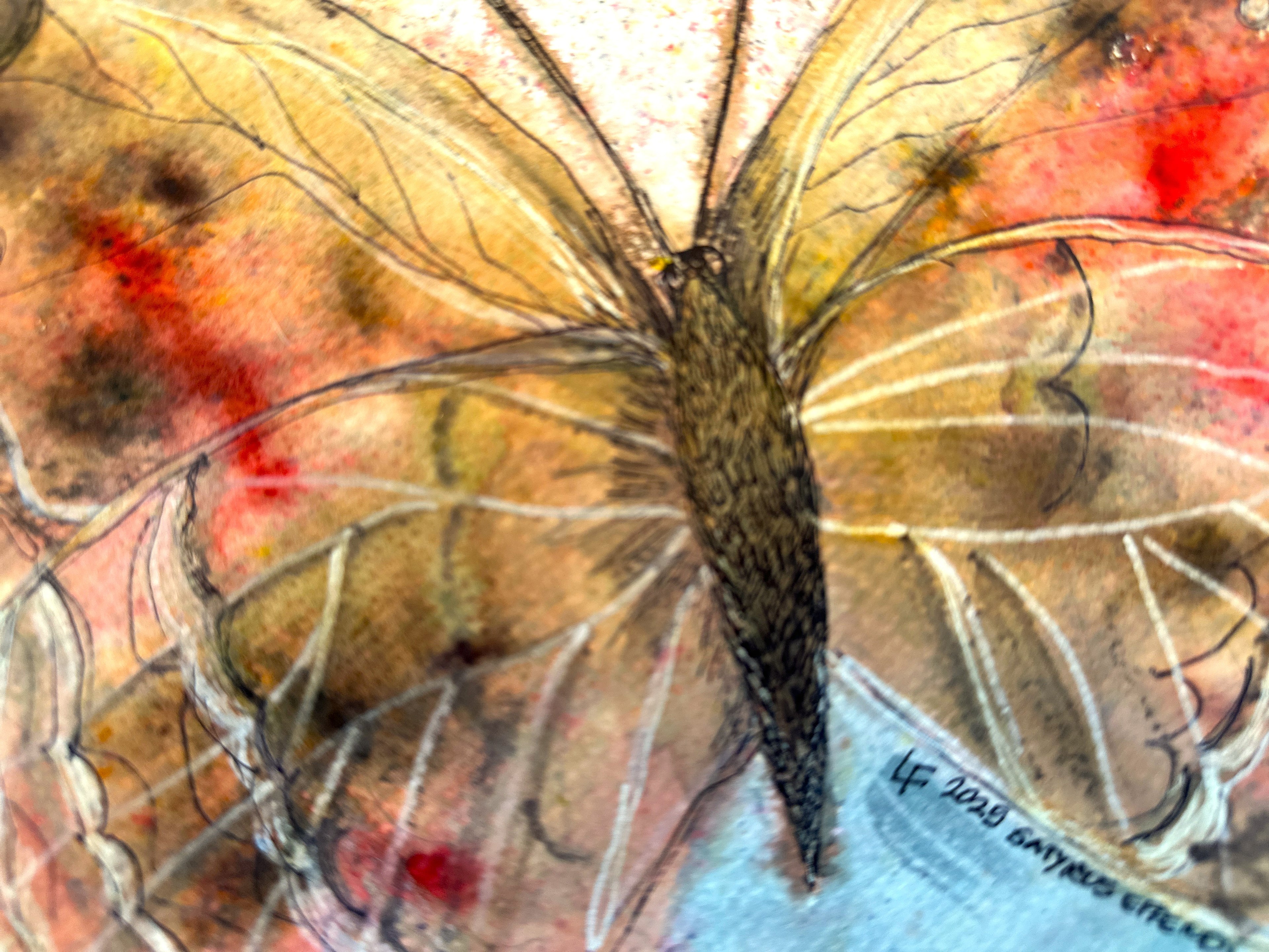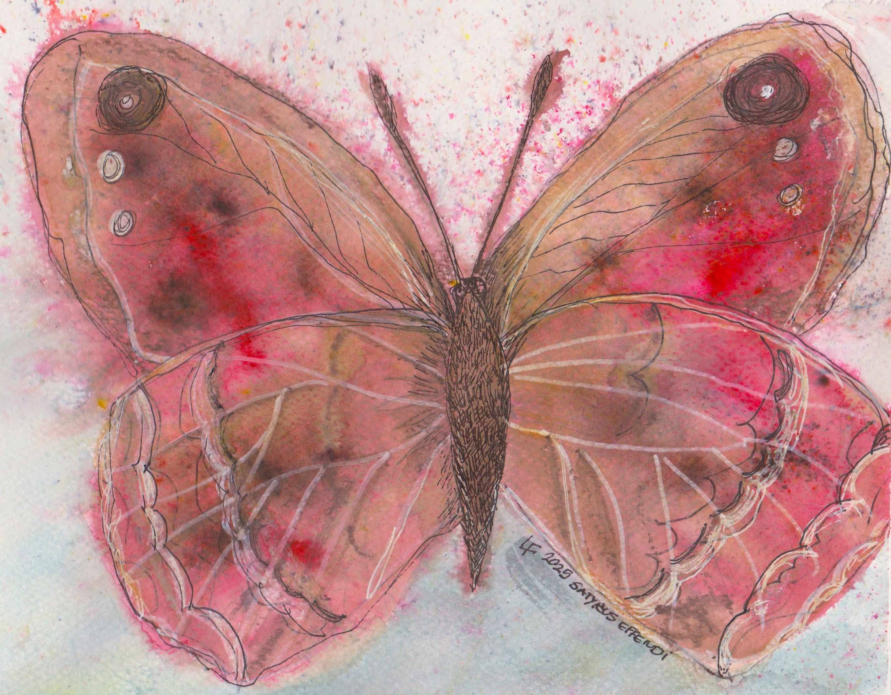 Butterflies remind us to trust change, to see each fleeting moment as sacred. The soft blushes and deep reds of Satyrus Effendi reflect that spirit — the warmth of love, the ache of memory, and the quiet joy of discovery. Its layered watercolor and delicate linework invite you to look closer, to pause and breathe, as if you might hear wings fluttering just out of sight.