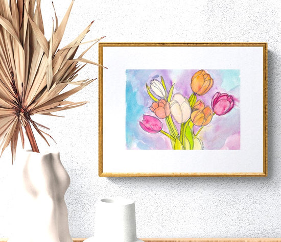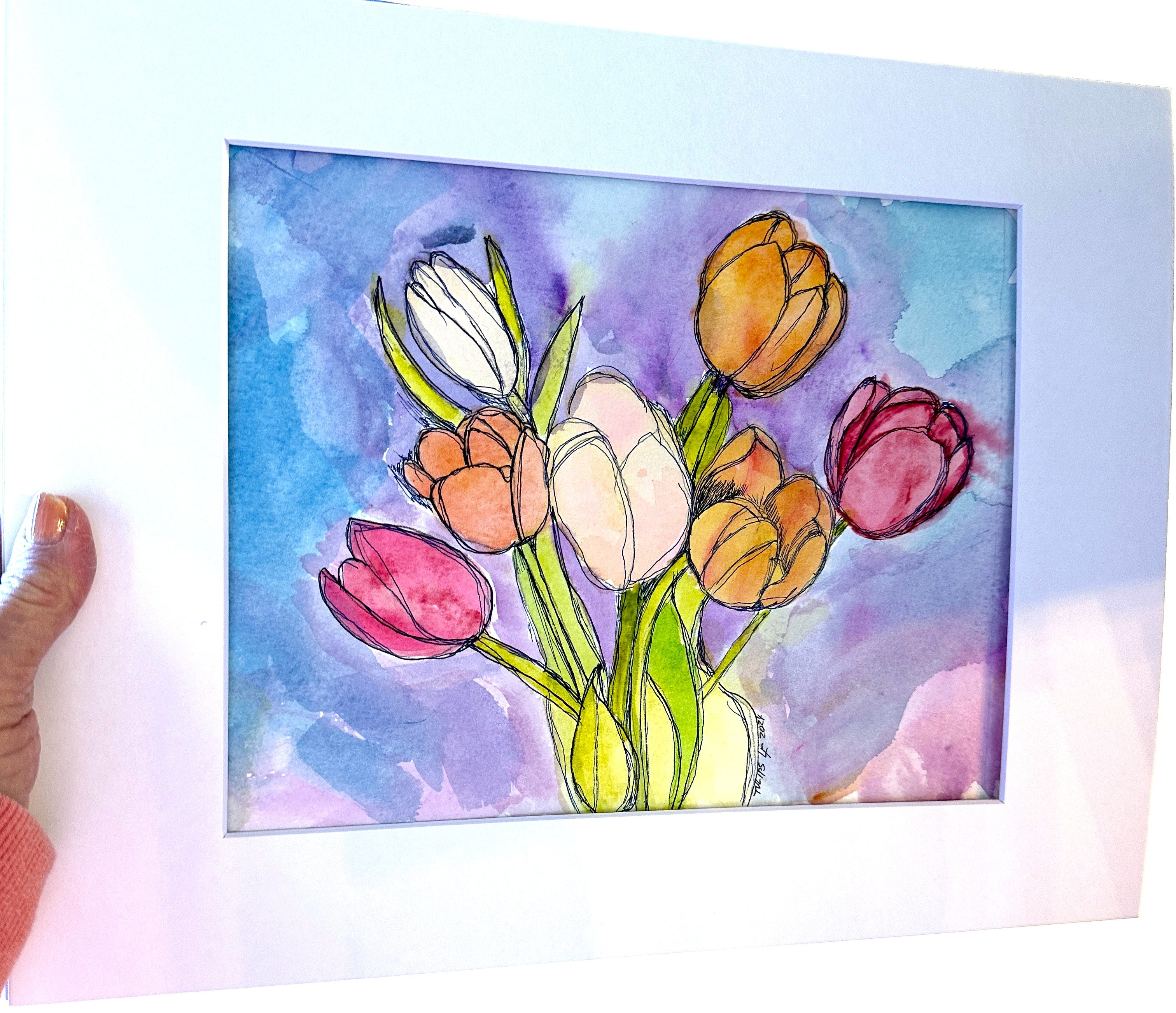 This original watercolor, Tulips, measures 9.5 x 7.5 inches, and will be shipped matted and ready to frame to 14 x 11 inches.