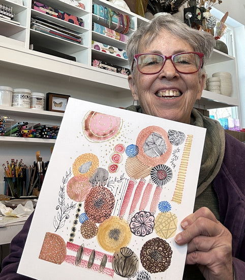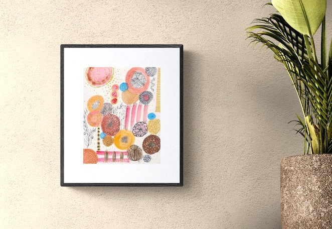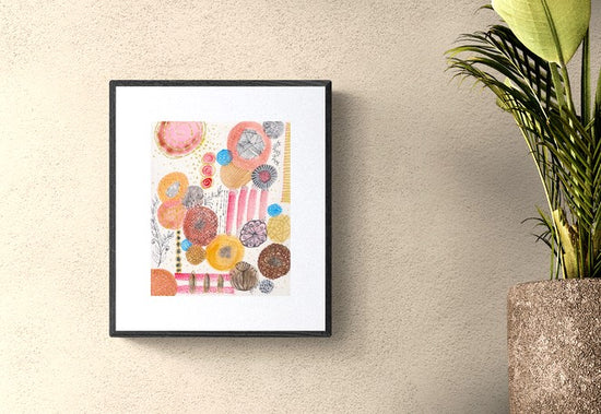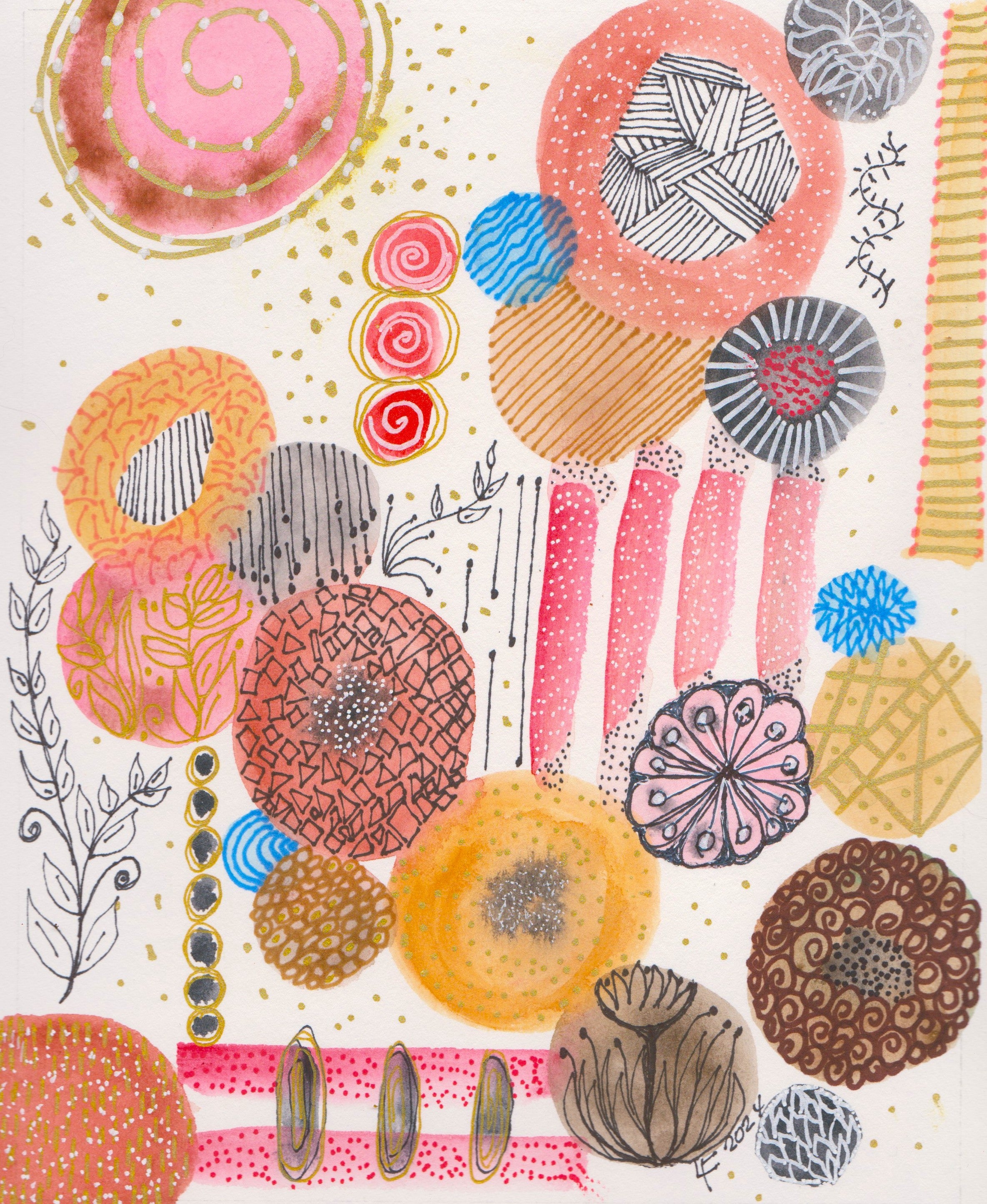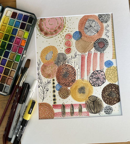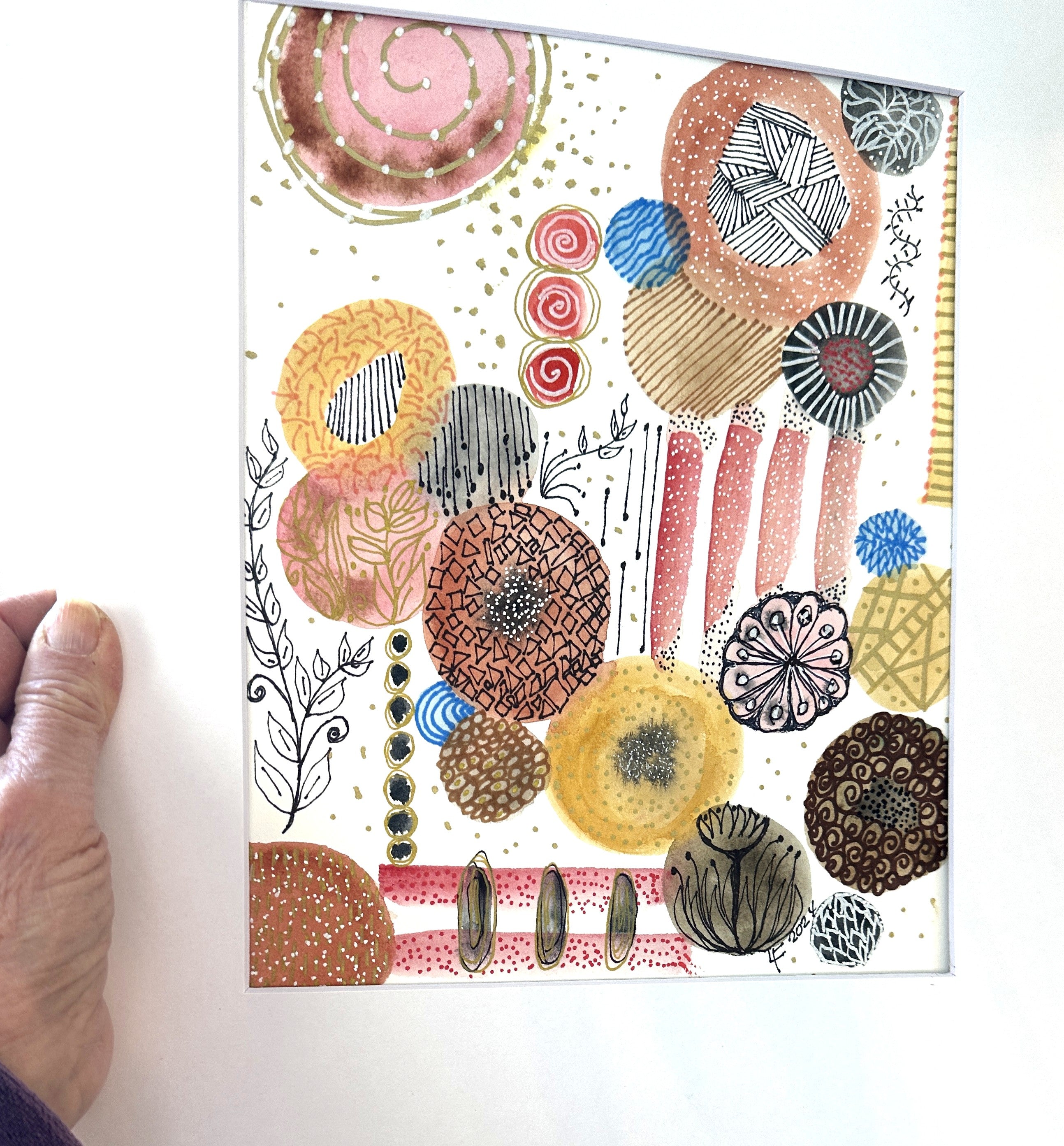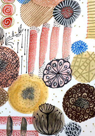 This original watercolor radiates warmth and happiness. Its soft organic shapes and intricate patterns dance across the paper, creating a world both lively and serene. Shades of rose, gold, and coral blend with subtle blues and browns, inviting your eye to wander and your spirit to rest.