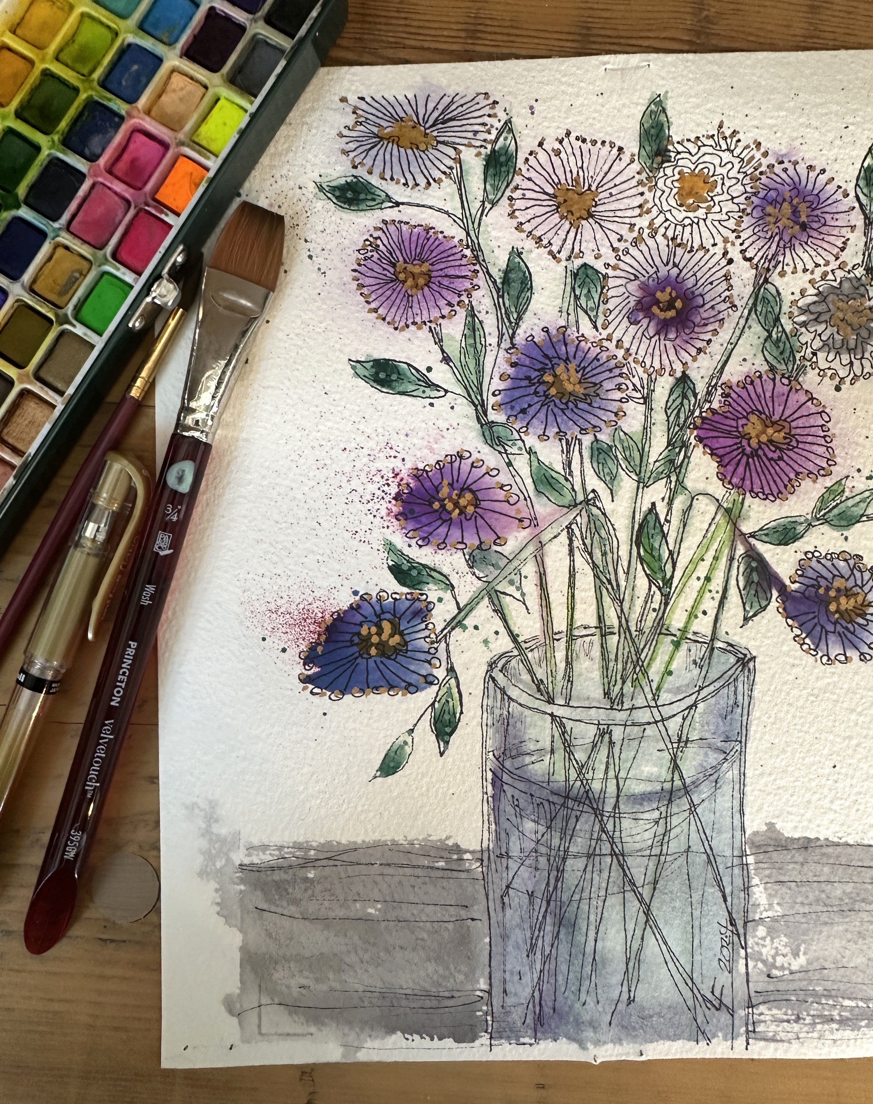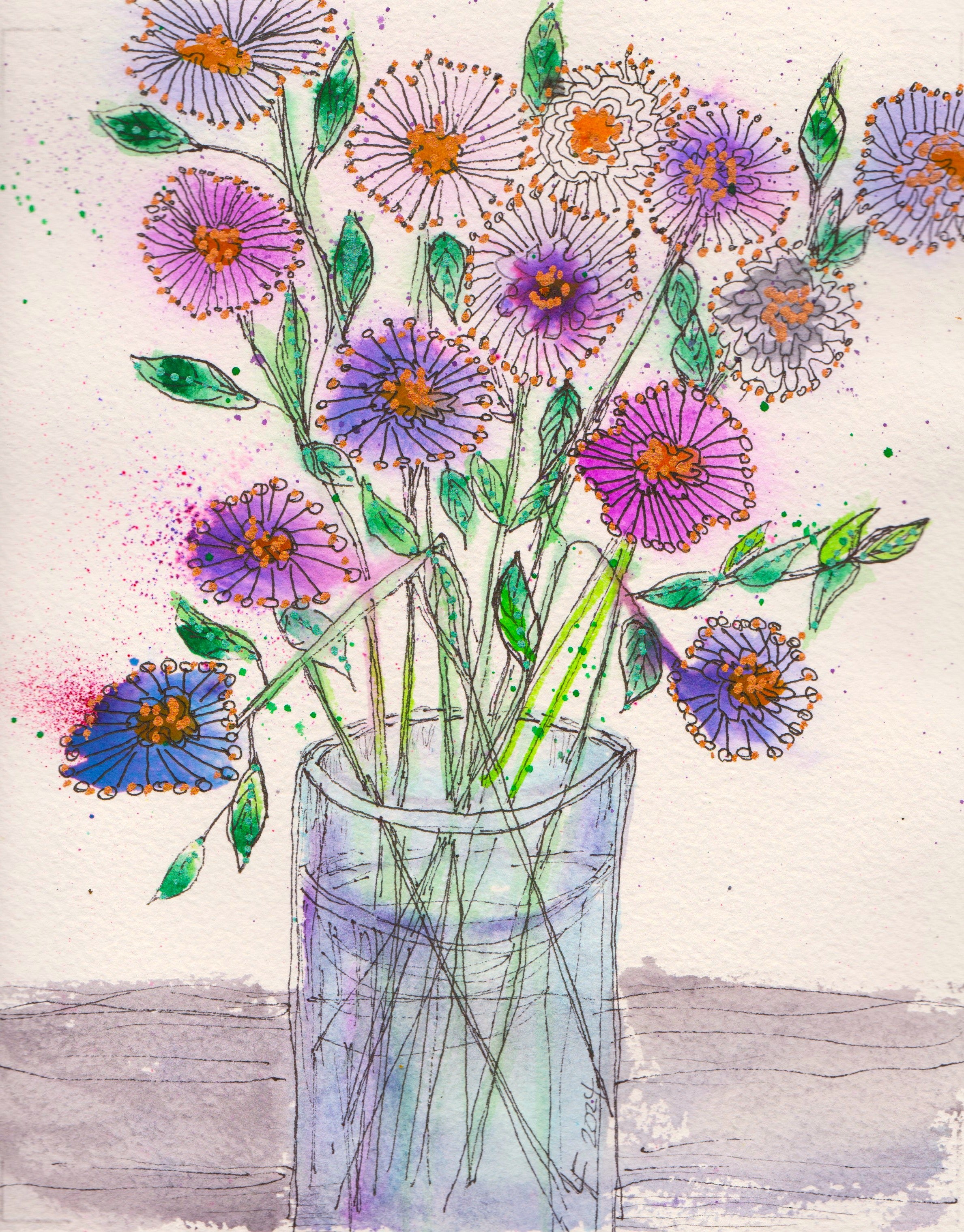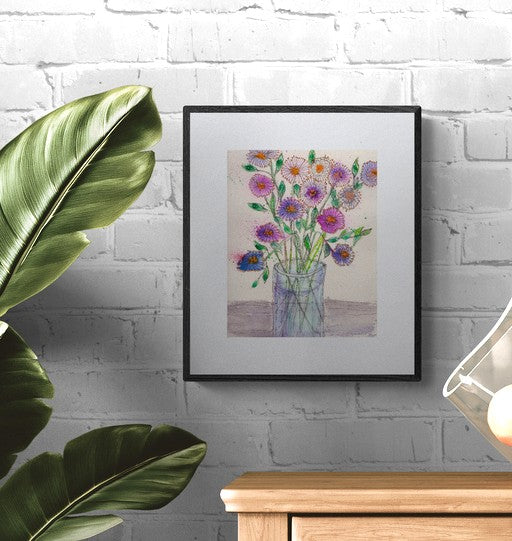 This watercolor grew from the same impulse that guides my brush in every piece: a desire to offer calm, beauty, and a reason to smile. Each bloom in the vase sways lightly with color and joy, a visual whisper saying, “Take a breath. You’re okay.”