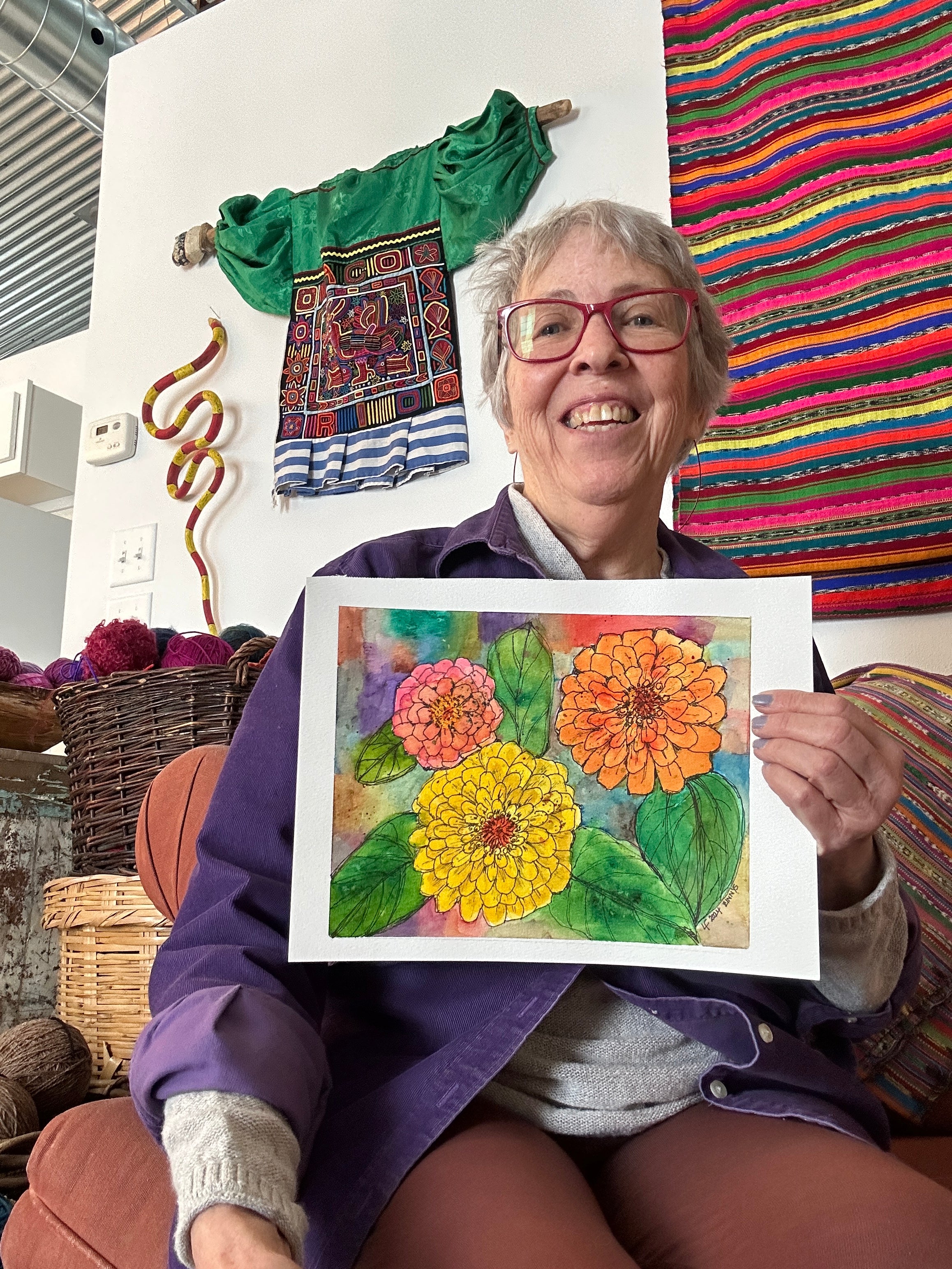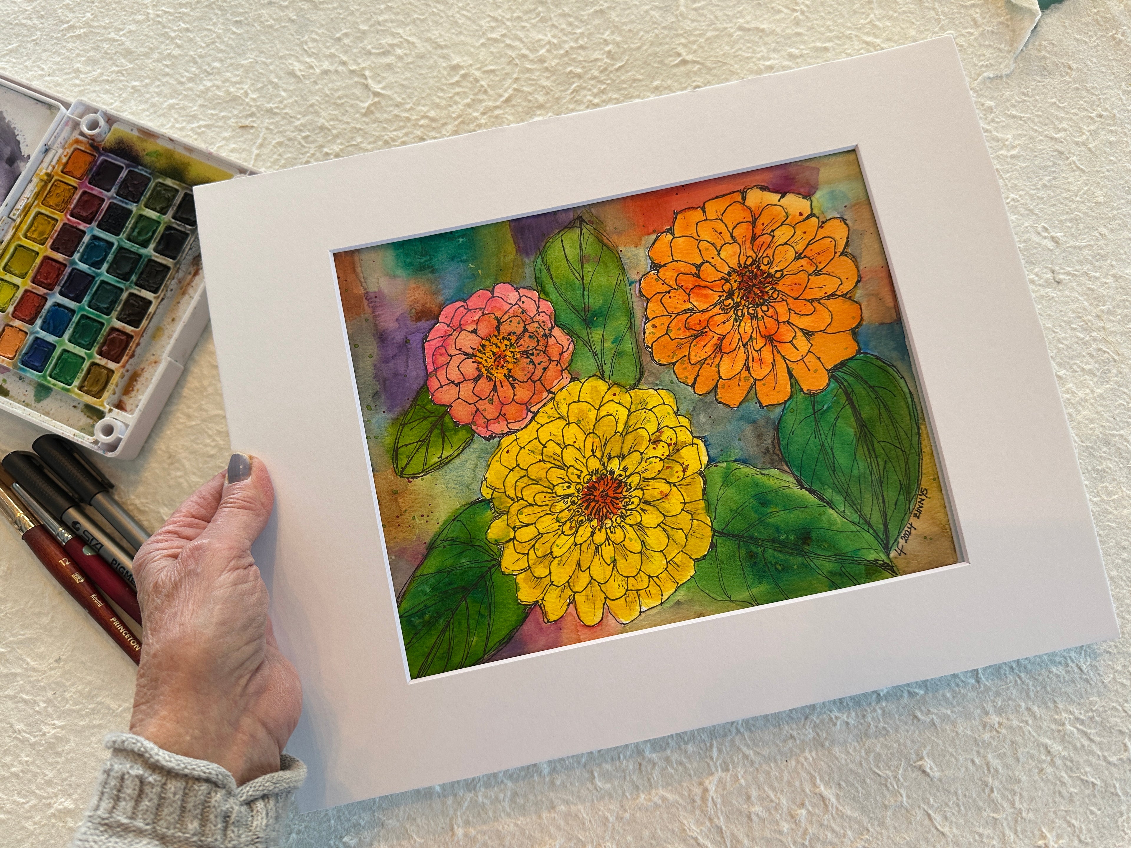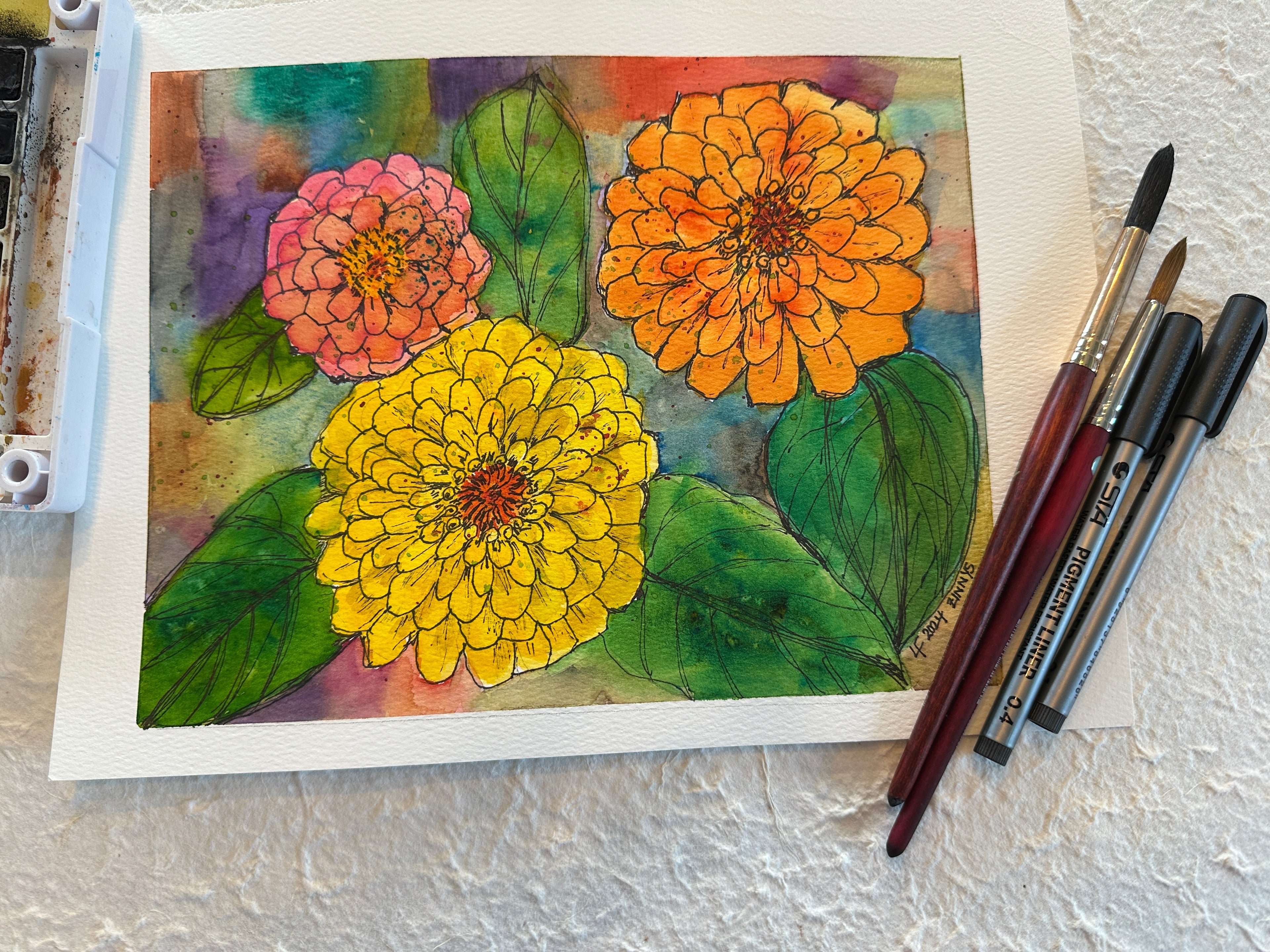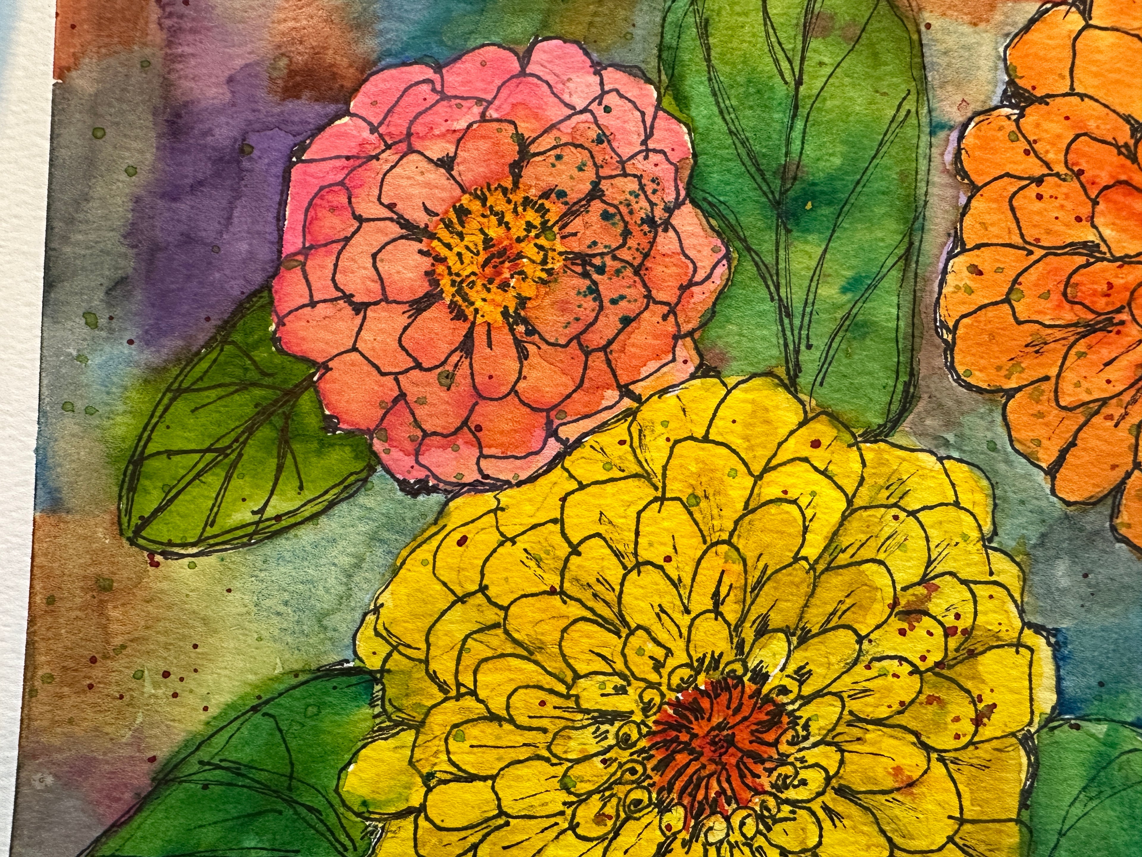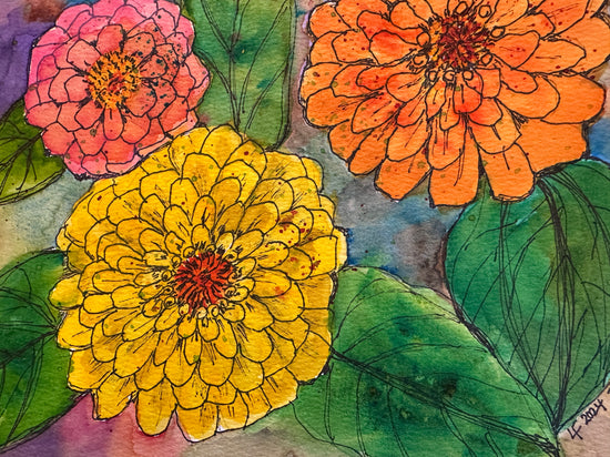 With watercolor and pen & ink, I painted Zinnys to share that same warmth and light with you. The reds, oranges, and yellows dance together on paper, bringing the hum of summer indoors — a daily reminder of nature’s simple, enduring pleasures.